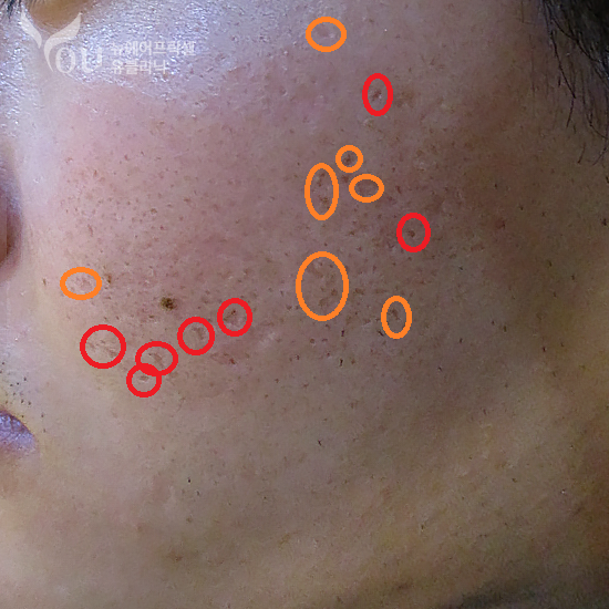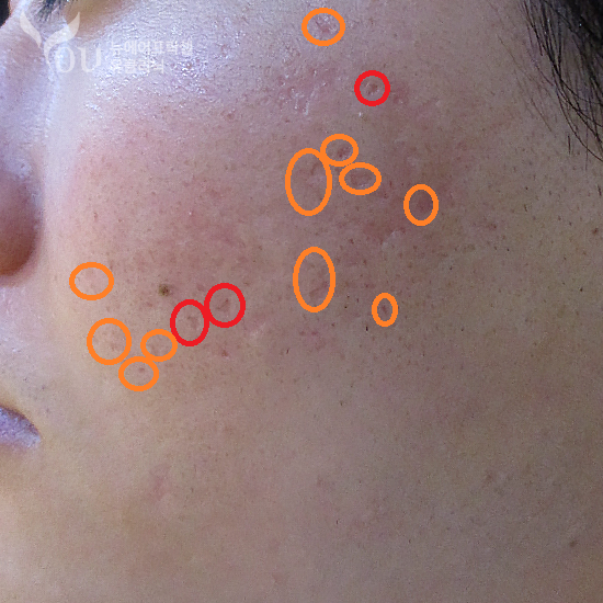 과거 치료경험이 없으셨으며, 흉터모양이 박스형, 송곳형, 롤링형이 다양하게 섞여있는 상태로 내원하셨습니다. 깊고 각진 흉터 테두리로 인하여 40점 이하의 흉터 테두리에는 (위 사진상 붉은색 원) 앙코르조각술이 시행되었고 그외 40점 이상의 각진 테두리에는 (위 사진상 주황색 원) 어븀조각술을 시행하였습니다. 흉터조각술 이후에 에어서브시전, 프락셀듀얼을 진행하였으며, 아래는 시술후 4주뒤 사진입니다.